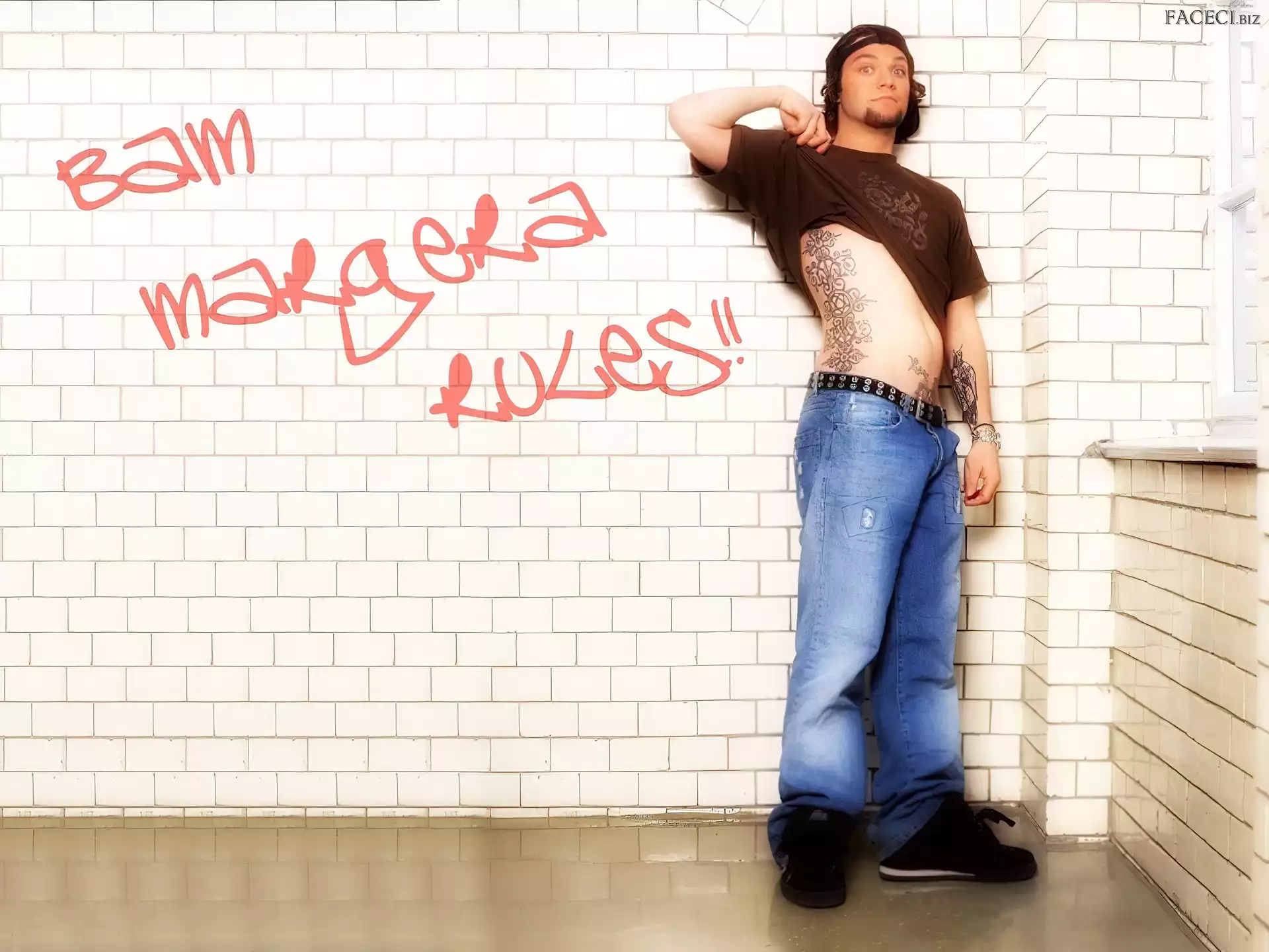 włosy, Bam Margera, ciemne zegarek, Bam Margera, deskorolka okulary, Bam Margera, butelka okulary, Bam Margera, twarze t-shirt, Bam Margera, brązowy kurtka, Bam Margera, rozpięta